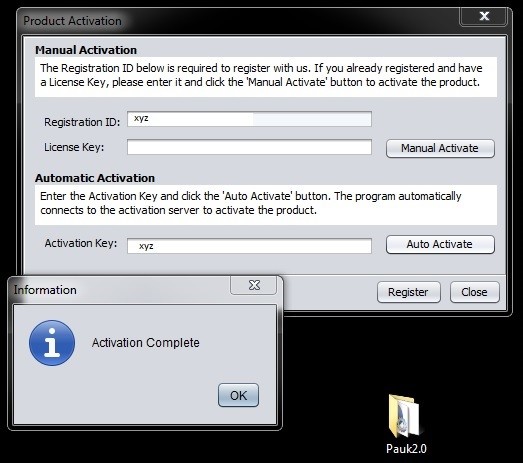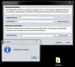 e) Enter the activation key in the “auto activate” field when you start Pauk. Pauk will be immediately activated.